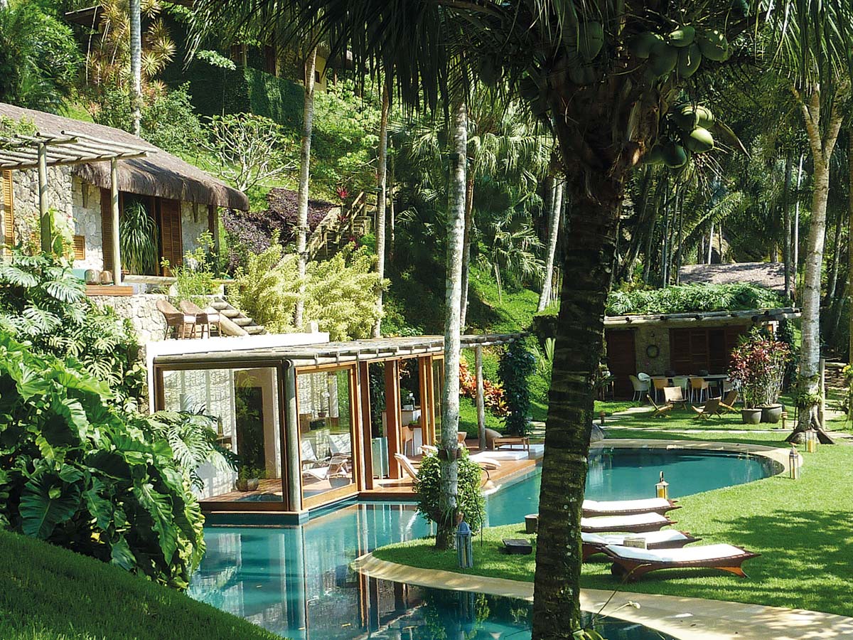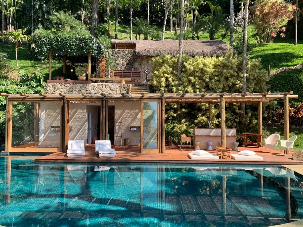 A poucos passos do mar, a piscina apresenta desenho sinuoso inspirado nas curvas cariocas, no Pão de Açúcar, e também para acomodar as árvores do terreno. As pastilhas têm a cor do mar, enquanto a borda em Fuget imita a areia da praia. Tudo ganha um charme extra com o deck, feito como uma palafita.