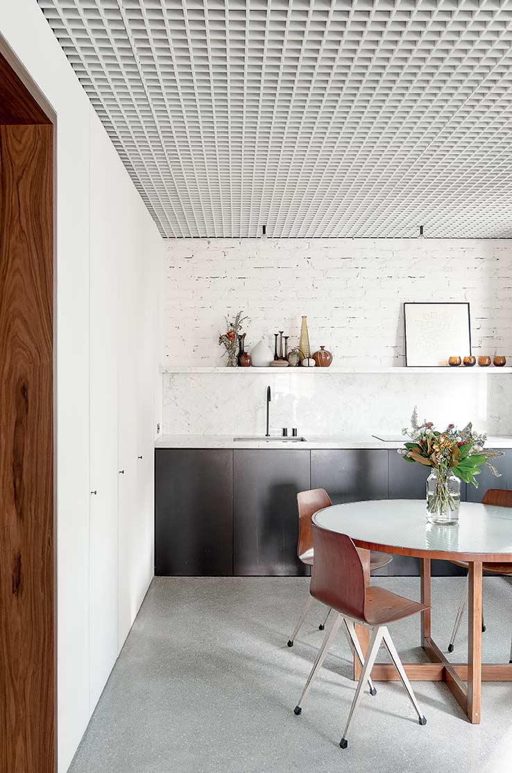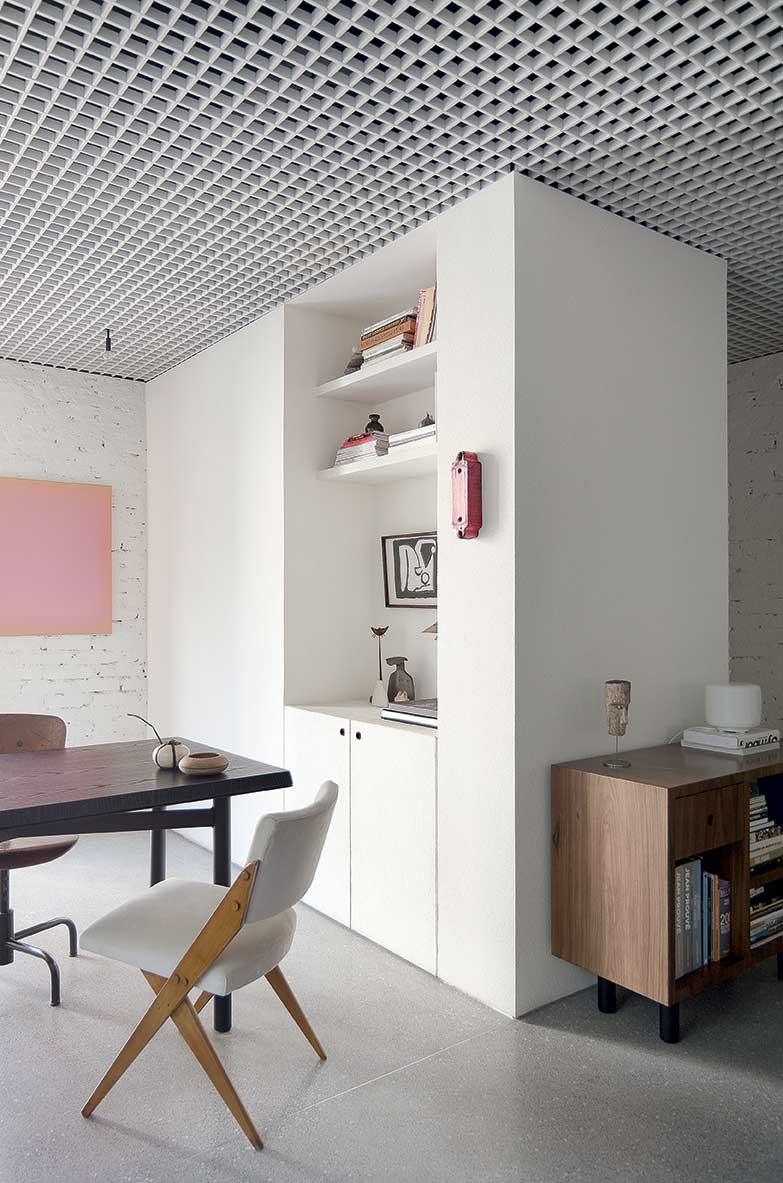 Para o piso, o granilite cinza ganhou destaque. O forro, do tipo colmeia de alumínio, é contínuo por todo o apartamento. O branco surge nele e também nas paredes, ora lisas, ora de tijolinhos aparentes tingidos. O mármore Carrara estampa algumas superfícies, conferindo ainda mais personalidade ao projeto.