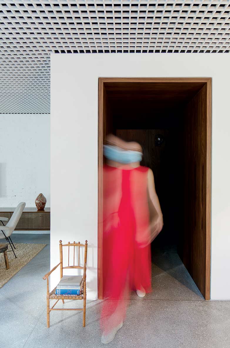 Uma pátina negra foi a eleita do casal para os elementos metálicos, e folhas de madeira pau-ferro aparecem na marcenaria, contribuindo para aquecer o espaço e complementar sua base neutra.