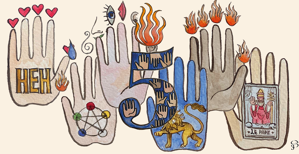 No Tarot, o quinto arcano é o Papa, símbolo da supremacia humana e da conquista plena da expressividade, é a carta do profissional. Na geometria sagrada, o 5 possui uma ação circular, pois todas suas potências nele finalizam. No panteão olímpico é o Mercúrio andrógino.