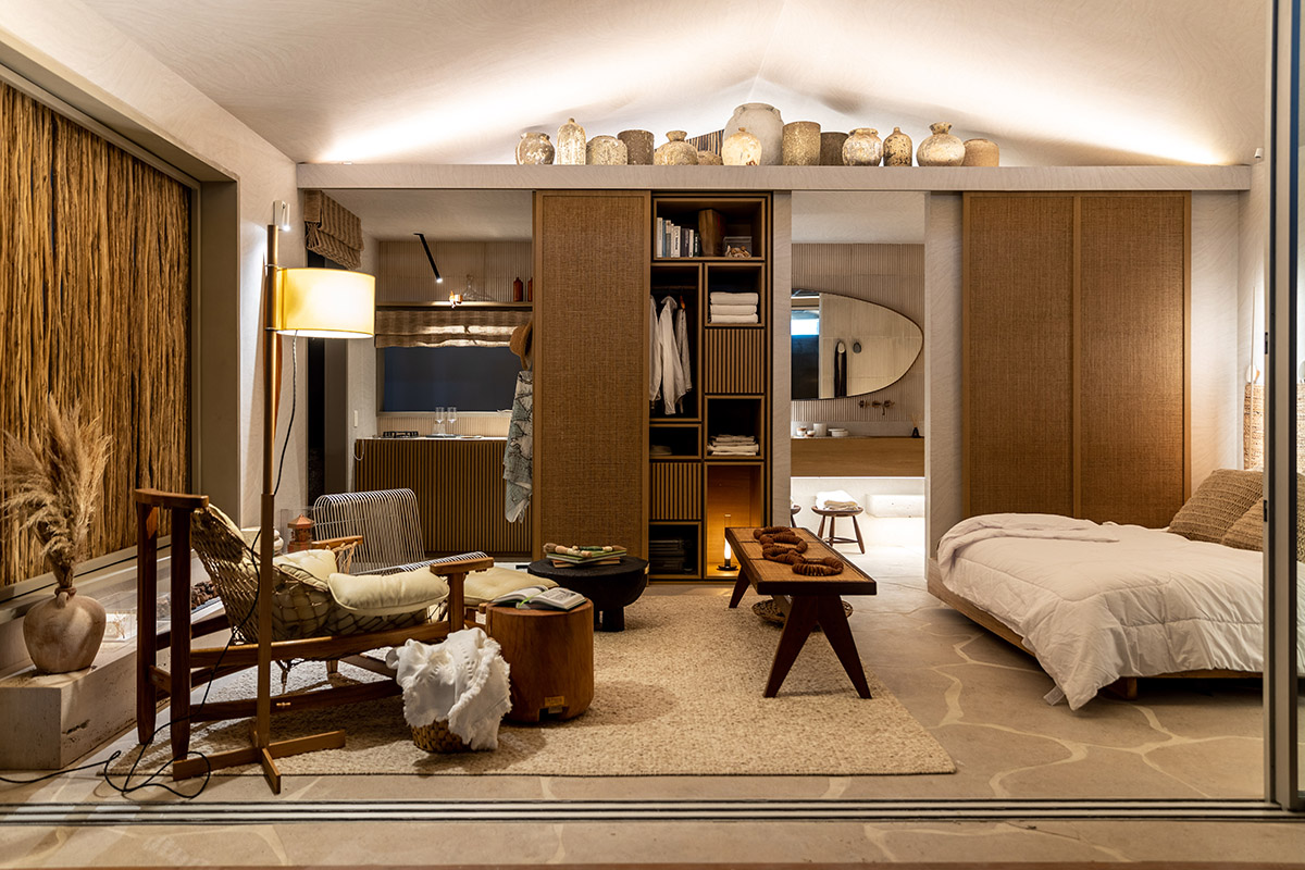 “Casa Almar”, por Rafa Zampini, marcando a estreia do arquiteto na mostra, seu ambiente traz solução arquitetônica de forma modular, dando destaque a elementos naturais, as tramas fazem protagonista no ambiente.