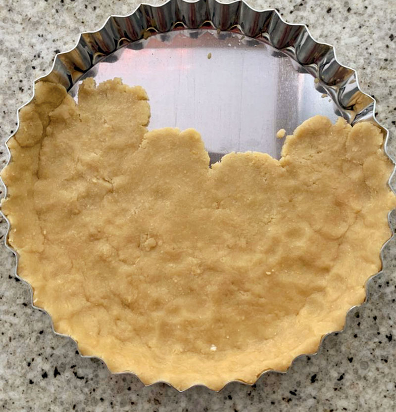 Em uma tigela, misture o trigo, o açúcar e o fermento. Acrescente a manteiga e misture com as pontas dos dedos. Junte o ovo e a gema e amasse com as mãos até formar uma massa homogênea. Molde uma bola, cubra com filme plástico e deixe repousar na geladeira por uma hora. Estenda a massa com um rolo e transfira para a forma untada com manteiga. Com os dedos, forre o fundo e as laterais. Espalhe recheio sobre o fundo da torta de forma a cobrir toda a superfície. Aqueça em forno preaquecido a 180 graus por aproximadamente 30 minutos até a massa tomar cor. Deixe esfriar para desenformar.