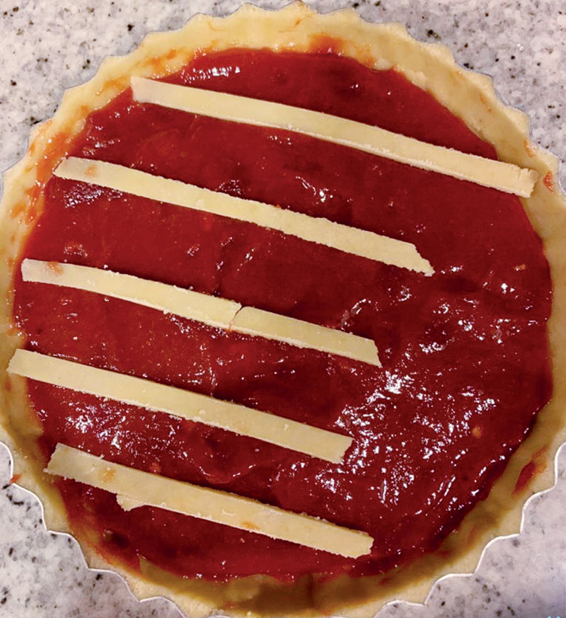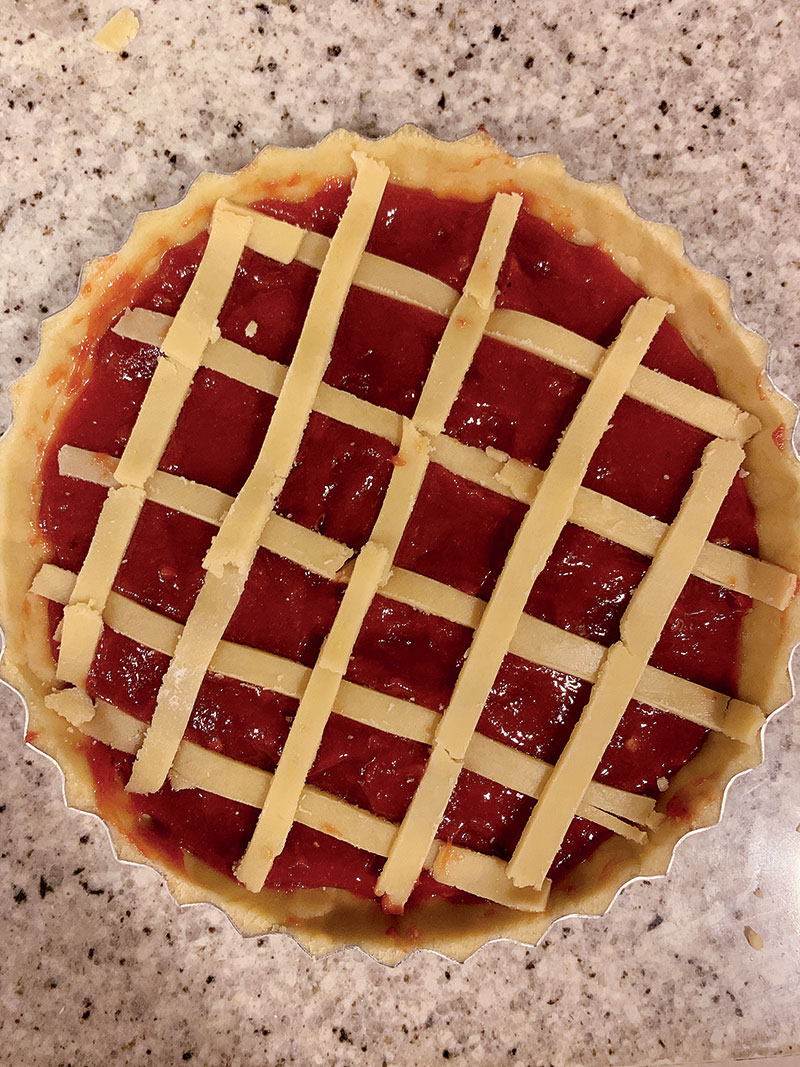 Separe um pedaço da massa para fazer as tirinhas. Antes de abrir, coloque novamente na geladeira, isso irá ajudar a cortar as tirinhas para decorar. Forme um desenho de losangos como se fosse uma treliça, esse desenho é a verdadeira característica da crostata. Essa quantidade de massa dá para fazer 6 tortinhas individuais.