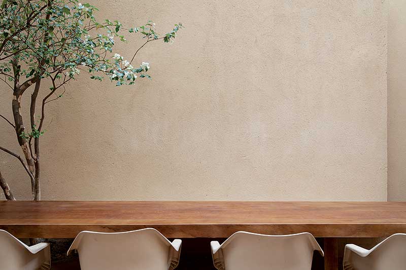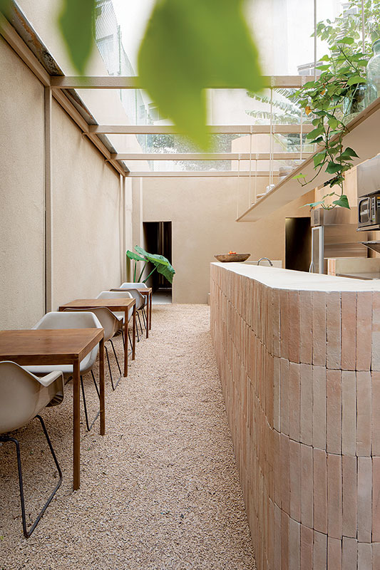 O espaço foi projetado pelos arquitetos André Pepato e Mariana Schmidt, sócios do estúdio MNMA. Logo na entrada, é possível perceber o contraste entre uma fachada translúcida, de policarbonato, com os materiais terrosos no interior, que criam uma atmosfera calma e tranquila.