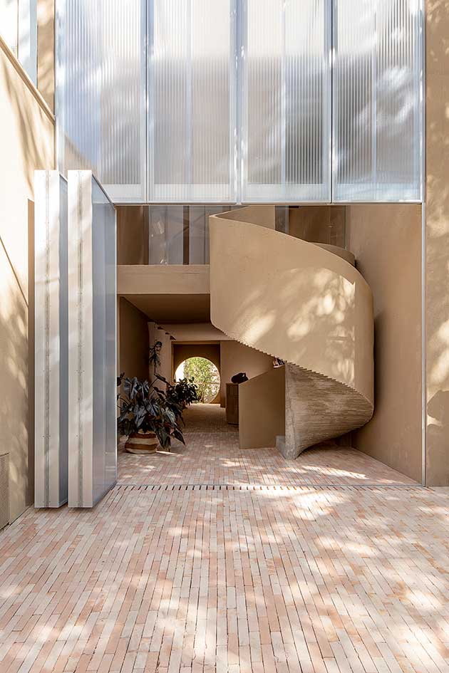 “A forma da escada foi mol- dada manualmente em madeira dentro da própria obra com sobras de materiais. O rigor do desenho técnico abraçou pequenas deformações, sinal de uma escala íntima e gestual”, explica a arquiteta Mariana Schmidt.