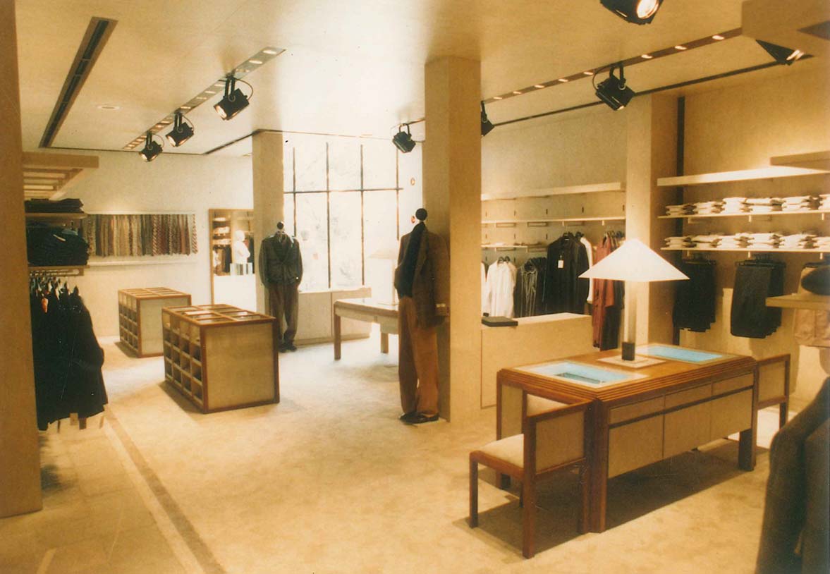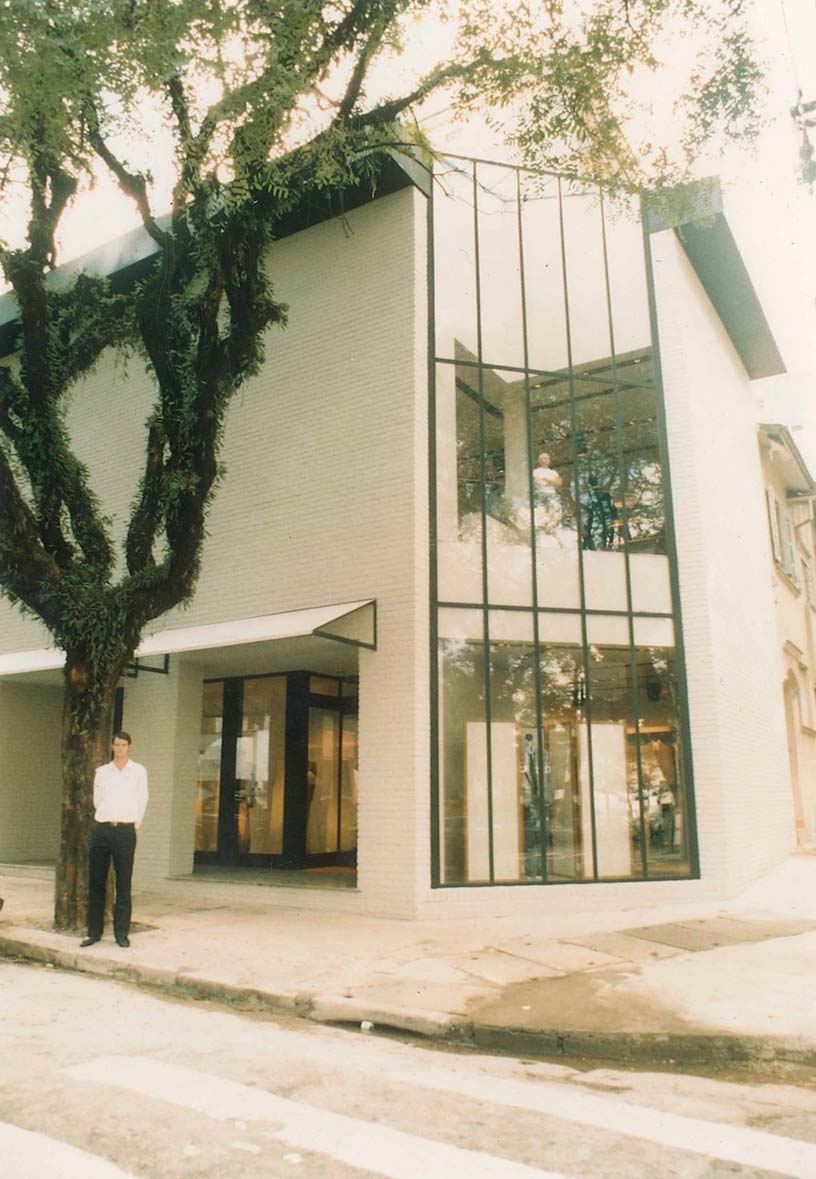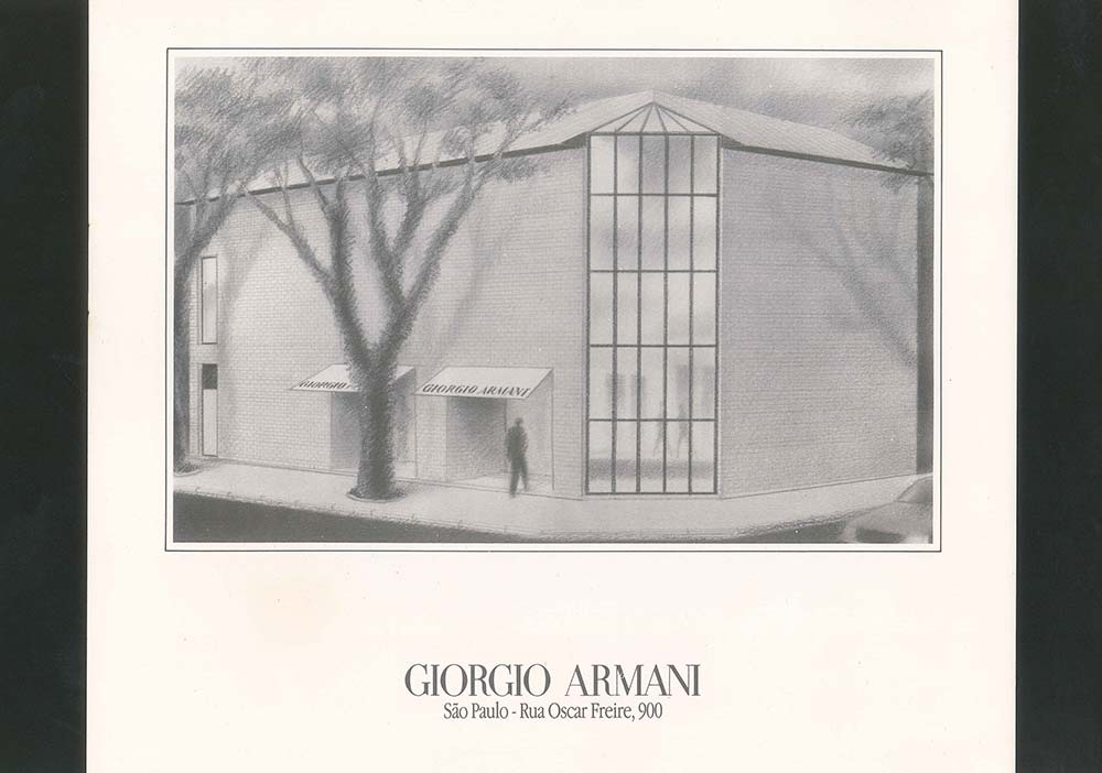 Montamos a primeira loja em 1989, na Oscar Freire com a Bela Cintra,onde hoje é aKopenhagen, foi a primeira loja Armani no Brasil, veio todo o desenho de fora eum arquiteto brasileiro acompanhou o projeto.Foi a primeira noção de luxo que o Brasil experimentou, não tinha outra, tinha a Ralph Lauren na Oscar Freire, mas assim, daquele luxo moderno Armani,não tinha.A loja era toda de fórmica, mas uma fórmica com um efeito especial, tudo era único.