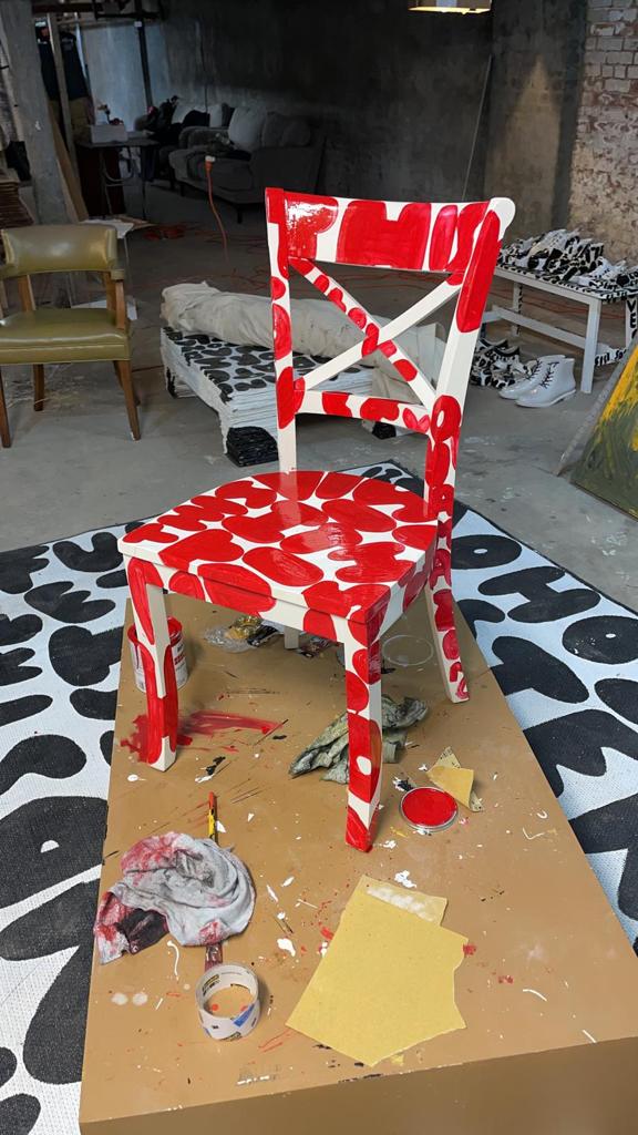 Para a exposição, entre as pinturas de Silva, encontramos as cadeiras de papel de Martin. “Em nossas caminhadas, víamos papelão no chão e embalagens da Amazon que pareciam ser muito maiores do que jamais havíamos visto em nossas vidas. Todas as lojas foram fechadas. As pessoas estavam mandando tudo para suas casas”, diz ele. “Usei esse material para empilhar e criar esses móveis.” A partir daí, Silva pintou as peças para completar a colaboração.
