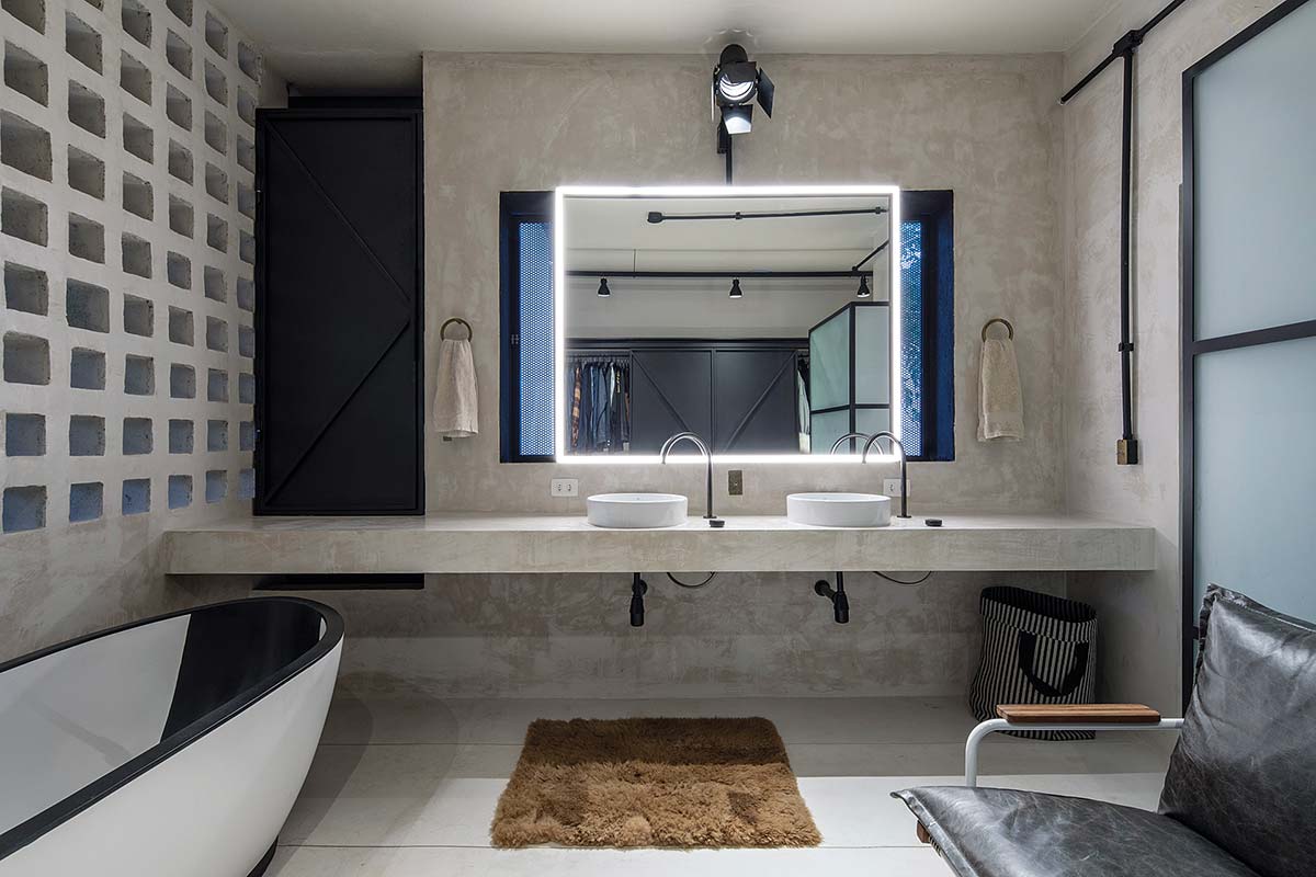 Na suíte master, a cama, que fica sob uma base de alvenaria, e a parede de cobogó em concreto – utilizada como elemento divisor entre dormitório e banho – são as peças-chave do ambiente. A decoração foge do convencional e traz materiais naturais e tons neutros mesclados com toques modernos, de forma a criar nos ambientes este clima high tech aconchegante. Assim como o projeto de arquitetura, a marcenaria e o mobiliário são originais e têm design autoral assinado por Felipe.